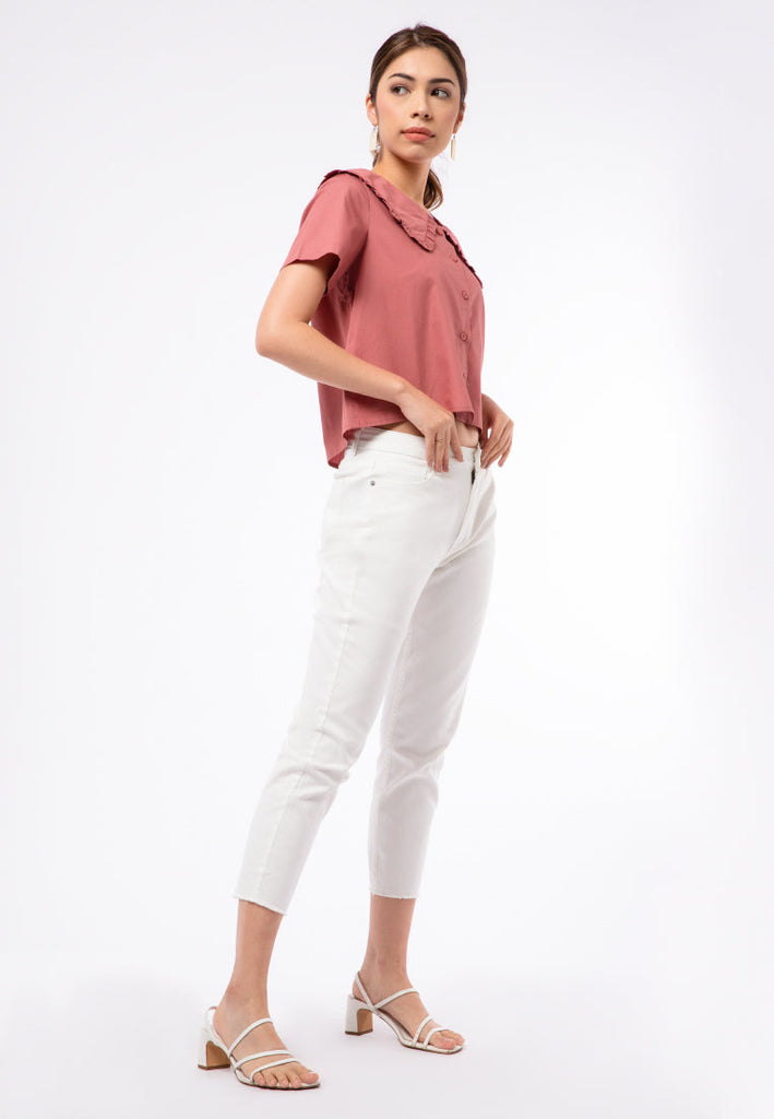 - Wide collar with frill details