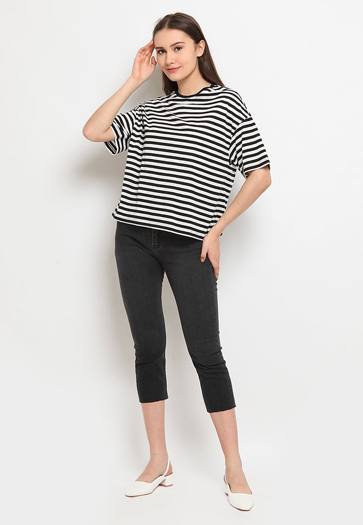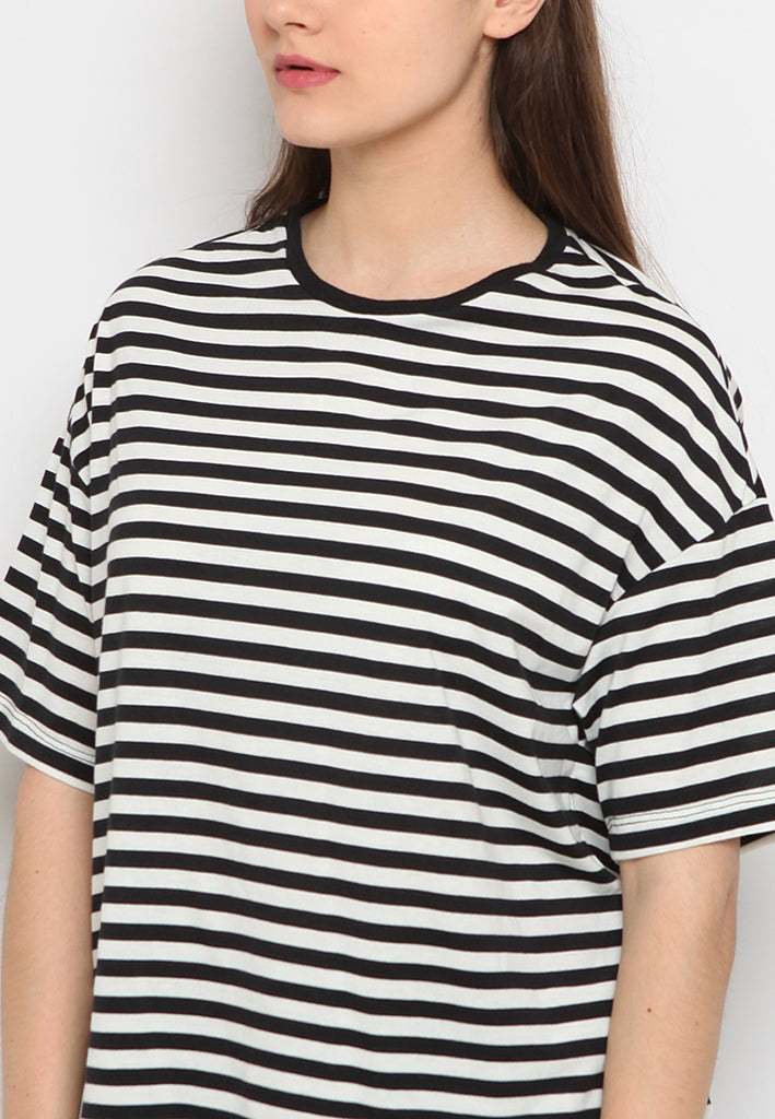 T-shirt crop lengan pendek, kombinasi warna di kerah, wide sleeve details, drop shoulders